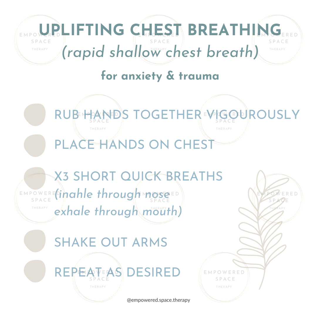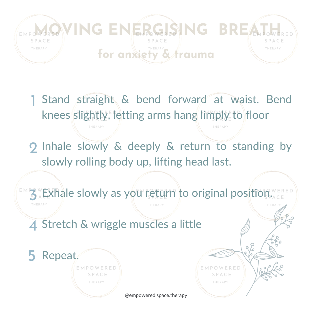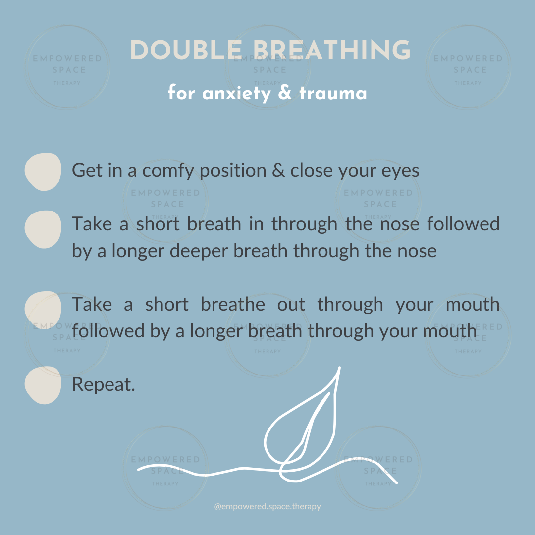 I personally love techniques that incorporates breath holds and many of my clients find these two breathing strategies really powerful tools for decreasing anxiety and creating safety in their bodies. Often clients tell me they like the visual of the sqaure breathing and it helps them to bring to mind a square of draw one on the palm of their hand as they breathe.
